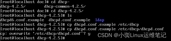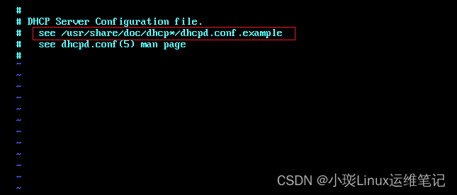 看到第二行 意思要去到这个文件下 把dhcp.conf.example复制到当前文件夹下并改名为dhcpd.conf