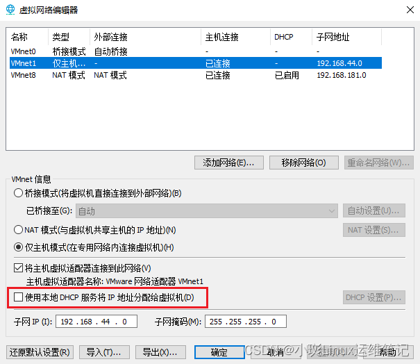 在点击虚拟机左上角编辑>虚拟网络编辑器>Vmnet1>取消使用DHCP服务器分配IP