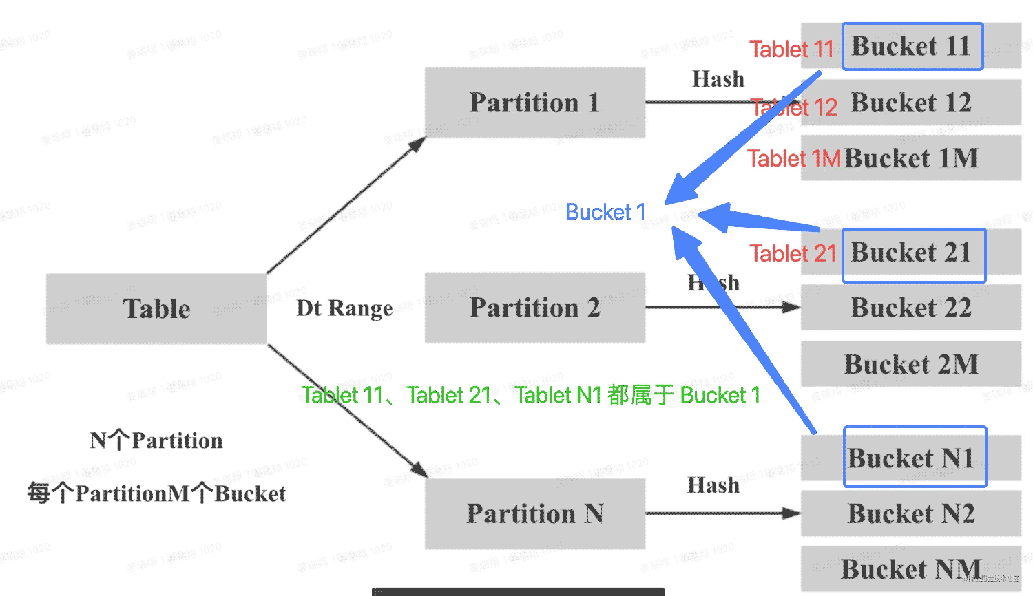 - 从逻辑上来说,Bucket 1 可以包含 N 个 Partition 中划分得到的数据,比如下图中的 Tablet 11、Tablet 21、Tablet N1