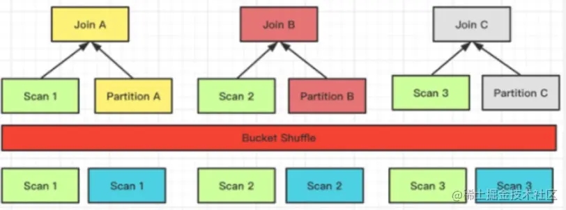 - 每个 Partition 通过相同的 Hash 方式将其中的数据划分为 M 个 Bucket(Tablet)