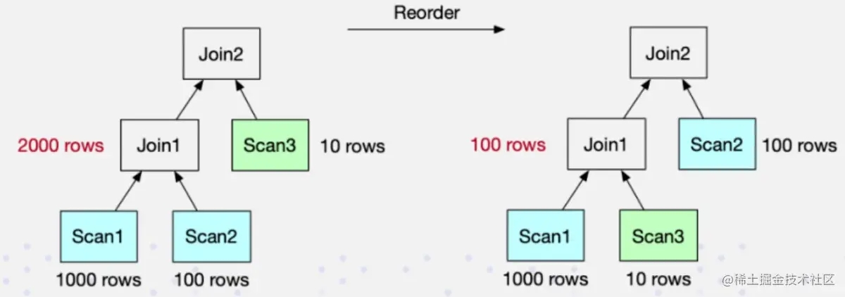 有了前面两表 Join 的 Runtime Filter 铺垫,再来看 Join Reorder 的优化,逻辑关系上就能够理顺了。