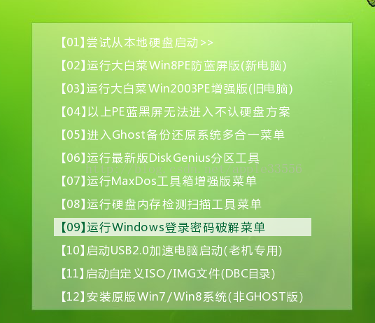 首先做个启动U盘,网上大白菜、老毛桃之类的制作工具很多,随便找一个,U盘做好后用U盘启动服务器,进入菜单,选第9项。