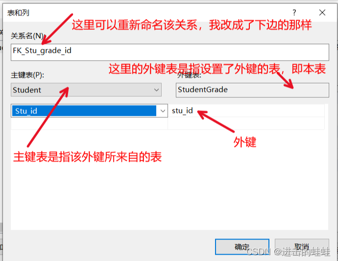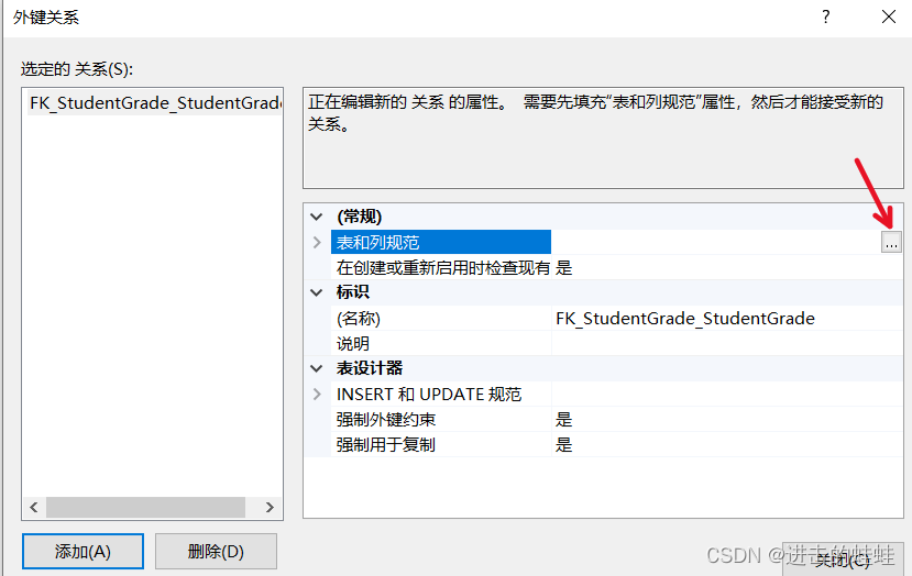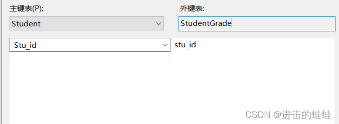 (假设正在设置的这张StudentGrade表称为本表,其他表相对地称为外表),我认为外键表应该是指外键本来所在的表,即外表,因此应该设置为Student才对,但是这个框框一直编辑不了;而主键表应该指我正在编辑的这张StudentGrade表才对,但是当选择StudentGrade之后,下面列选项的框框就变成空的,没有列可选。