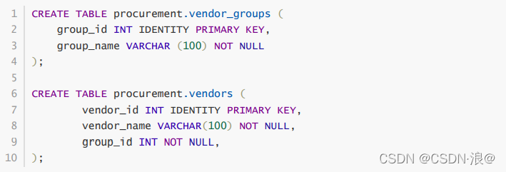 接下来就是外键约束:SQL Server外键约束简介外键是一个表中的一列或一组列,它唯一地标识另一个表的行。 vendor_groups 和vendor表,它们的结构(如图所示):