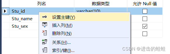 b.选择属性Stu_id,右击,选择设置主键