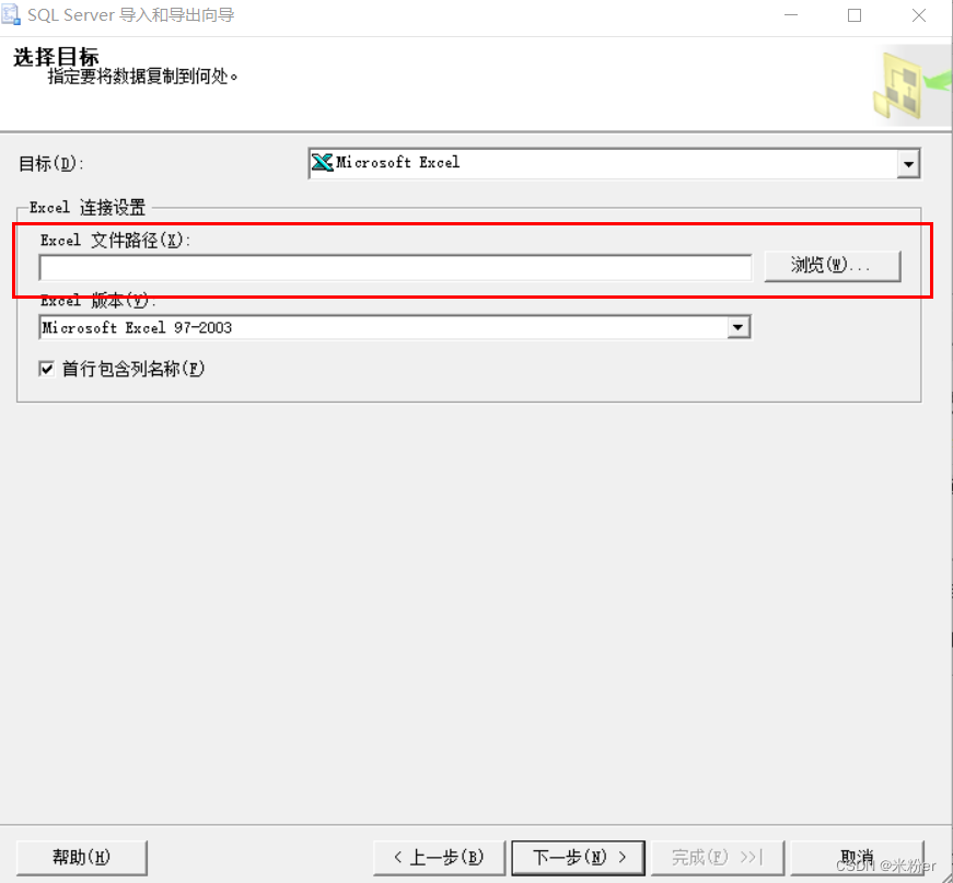 3.选择目标为Mircosoft Excel,选择Excel需要保存的路径,单击下一步