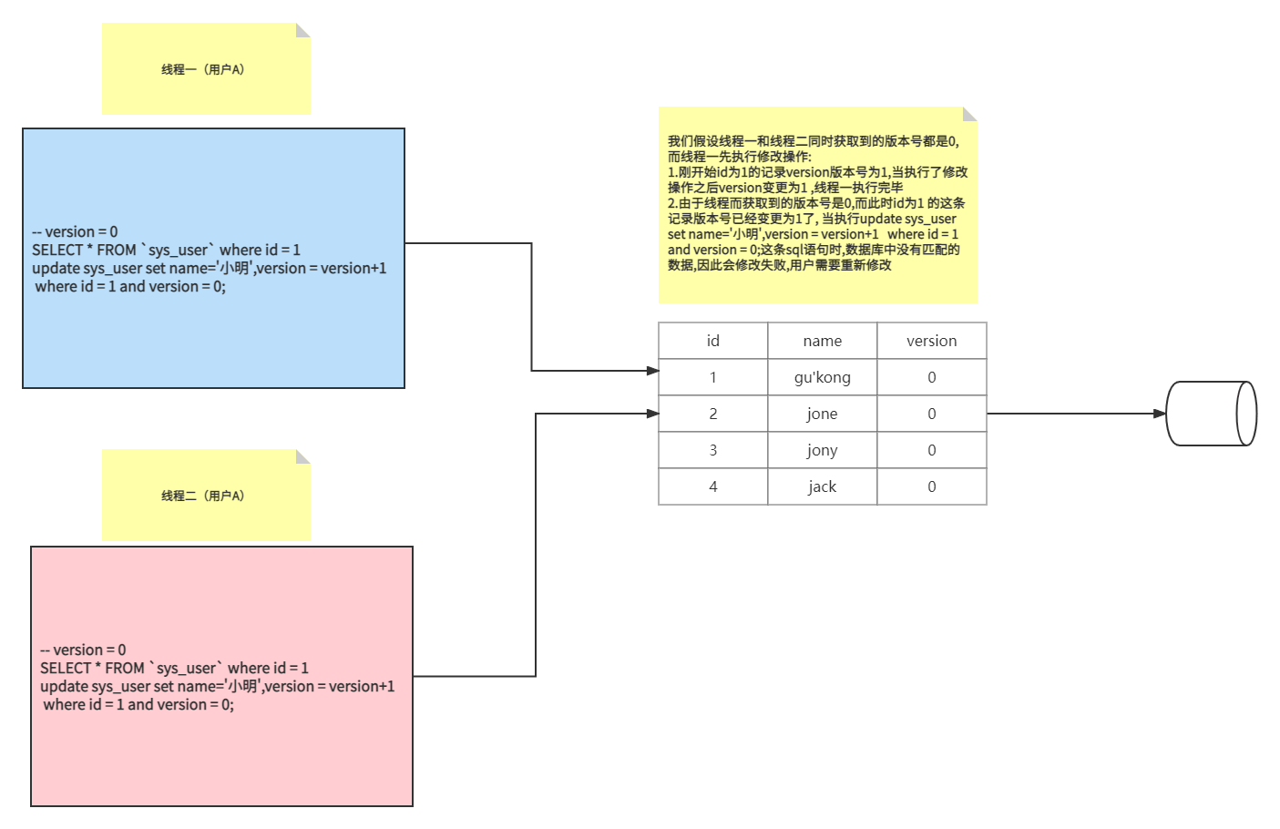 update sys_user set name=’小明’,version = version+1 and age = 20 where id = 1 and version = 0;