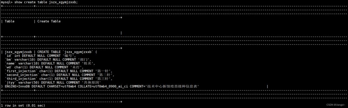 ) ENGINE=InnoDB DEFAULT CHARSET=utf8mb4 COLLATE=utf8mb4_0900_ai_ci COMMENT=’技术中心新馆疫苗接种信息表’