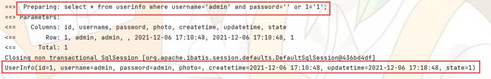 第三步,编写测试类,我们在这个测试类中,传入有注入问题的SQL语句' or 1='1,使得不需要密码就能拿到相关的用户信息。