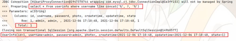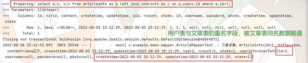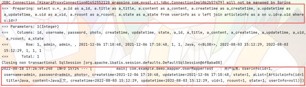 由于我们数据表与类的字段名是一致的,那些普通的属性都一一对应上了,都成功被赋值了,但是由于UserInfo类在数据表中没有,所以并没有得到UserInfo对象,如果我们想要拿到这个对象,我们得使用resultMap。