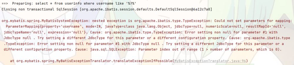 运行结果:报错了,因为#{}会被替换成一个字符串,而在这个%#{username}%语句中#{username}不能带上引号,带上就违背SQL语法,造成错误。