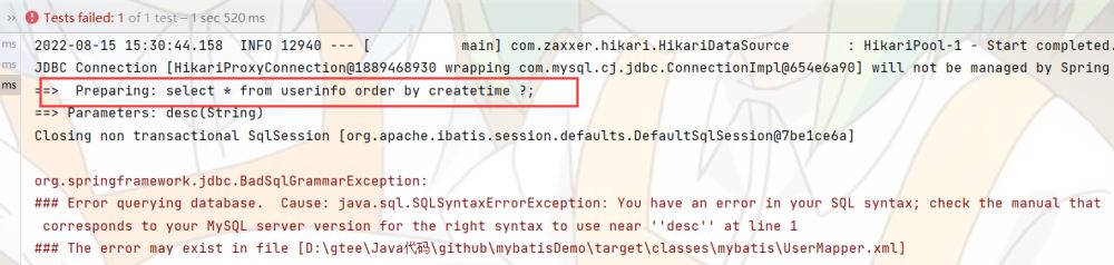 我们发现程序报错了,这是因为使用了desc的字符串替换了占位符,而我们所需要的不是一个desc字符串,而是直接一个desc的关键字,所以sql也抛出了语法错误,最终执行的sql为: