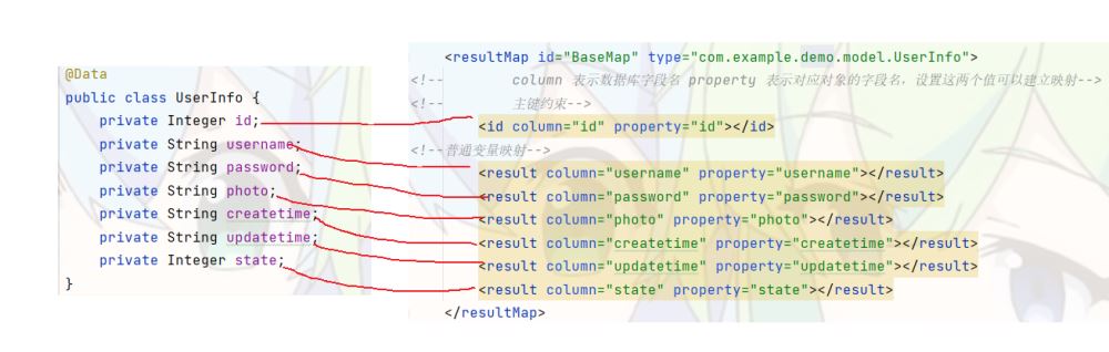 就像下面这样,图中类与数据表字段是相同的,实际情况会存在不同的字段名: