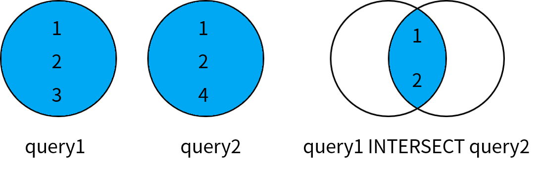 其中,1 和 2 是两个查询中都存在的数据;因此交集运算的结果只包含 1 和 2。