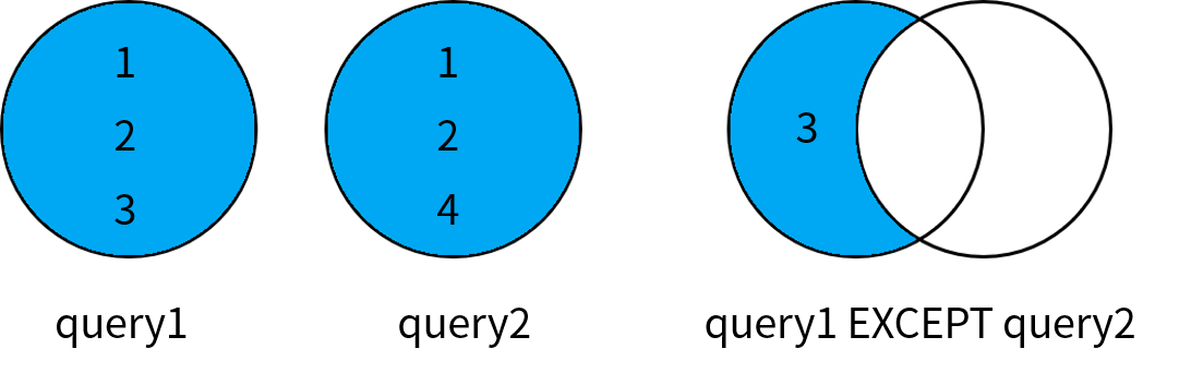 EXCEPT 操作符用于返回出现在第一个查询结果中,但不在第二个查询结果中的记录,并且对最终结果进行了去重操作。差集运算的示意图如下:
