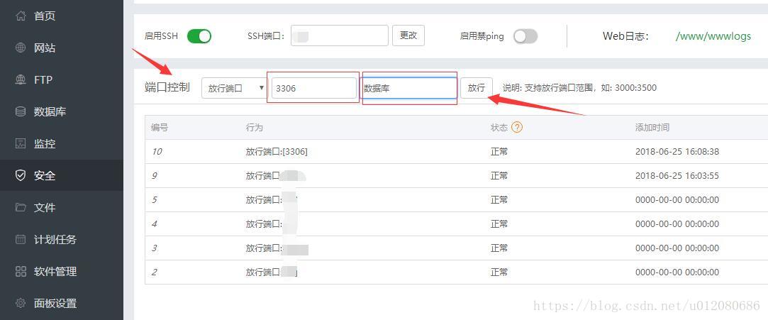 第二步:选择“安全”,设置放行端口,将3306填入第一个对应位置,后面自己写备注,然后点击“放行”按钮即可,也可以指定范围,如3000:3500。