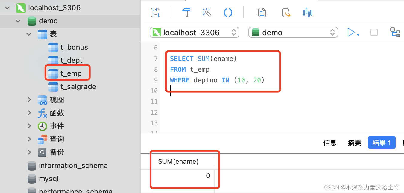 SQL 语句演示 SUM函数 案例(统计 ename(字段) 的综合 )