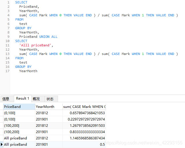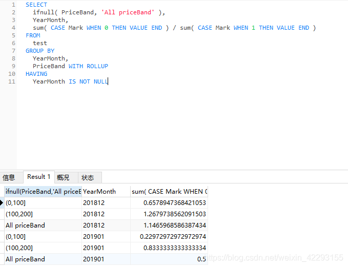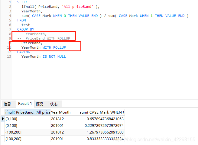 之前的group by 正常使用分组 加了 with rollup 在那个字段后就对所有价格区间进行统计 同时 with rollup 并不能放在 (group by a with rollup,b )中间