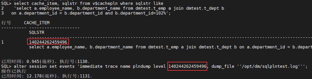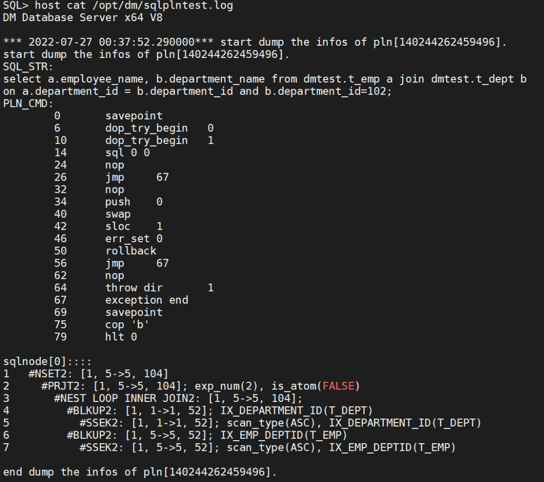 SQL> alter session set events ‘immediate trace name plndump level 140244262459496, dump_file ”/opt/dm/sqlplntest.log”’;
