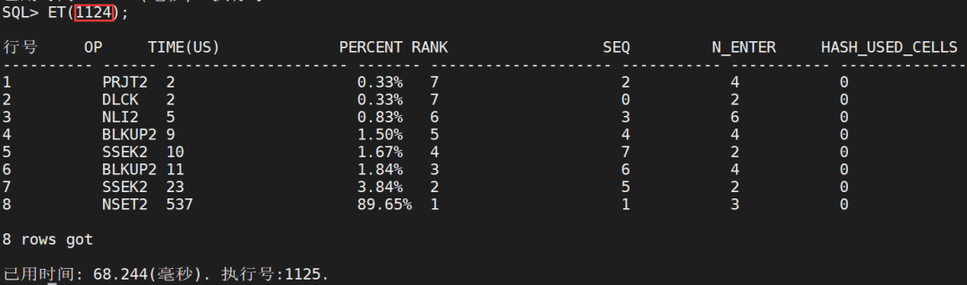 使用ET获取上述执行号为1124的SQL语句的执行计划和执行时间: