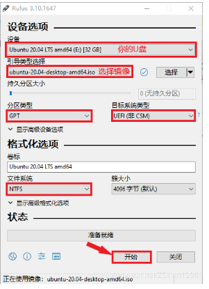 插入U盘, 运行 rufus-3.10.exe,按照下面选择,然后点击开始,等待完成即可