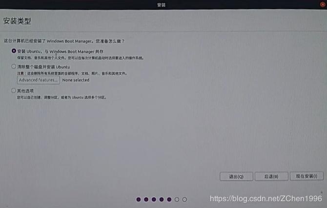 选择安装类型,安装Ubuntu,与 Windows Boot Manager 共存(好多安装教程不建议选择此项,说有问题,反正从16.04开始我都是这么装的,没出问题),网上也有好多选择其他选项安装的,如需要可自行查找,反正我是嫌麻烦(主要是懒)不想自己分区。