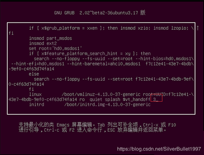 系统启动后,在BIOS引导界面按”ESC”键进入选择菜单,选择第一个”*Ubuntu”,按”e”键进入编辑模式。