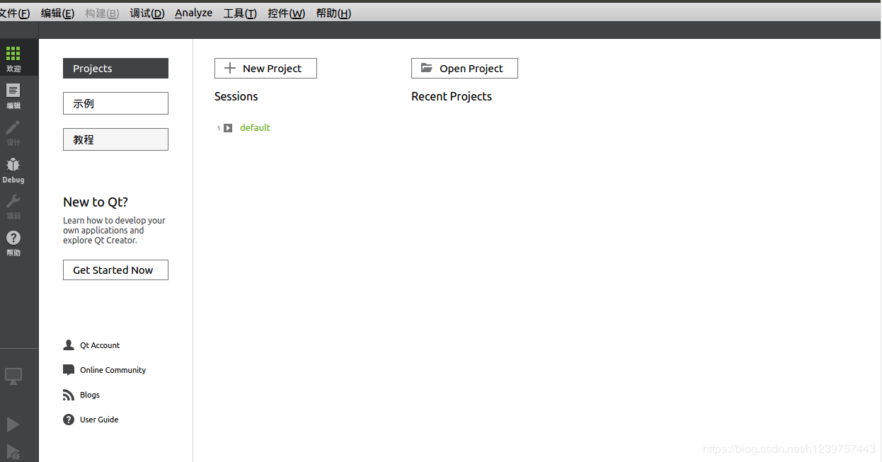 在/opt/Qt5.9.0/Tools/QtCreator/bin(这是我的安装路径)文件夹下找到qtcreator,双击打开qt creator,会出现: