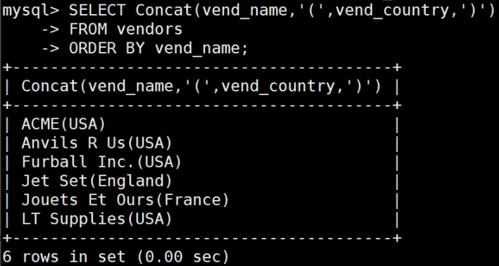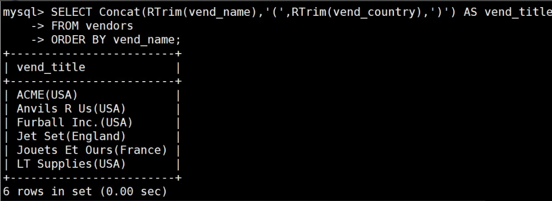 SELECT Concat(RTrim(vend_name),'(‘,RTrim(vend_country),’)’) AS vend_title