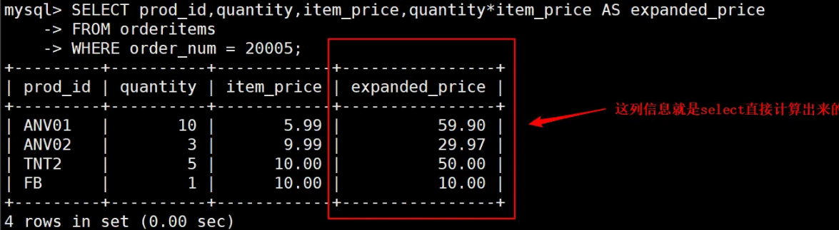 SELECT prod_id,quantity,item_price,quantity*item_price AS expanded_price