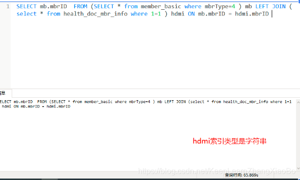执行查询后发现执行速度并未优化,仔细看之前同事设计的表,发现索引类型字段不一致,于是修改为varchar 为int后再次查询发现查询速度明显提升。