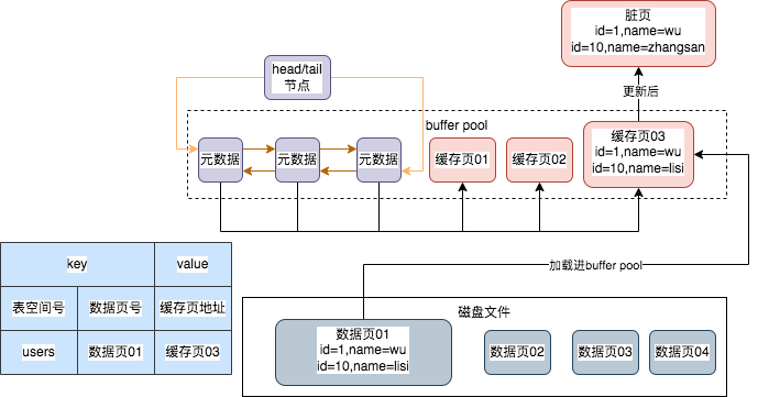 从图中即可看出链表的大致结构,那么现在我们要更新users表中id=10的记录,首先要知道id=10这条记录的数据页有没有在缓存页当中,然后在决定是否是加载数据页还是直接使用缓存页,所以,buffer pool里还有左下角这种hash表,用表空间+数据页号作为key,缓存页地址为value,可以快速判断数据页是否被缓存。