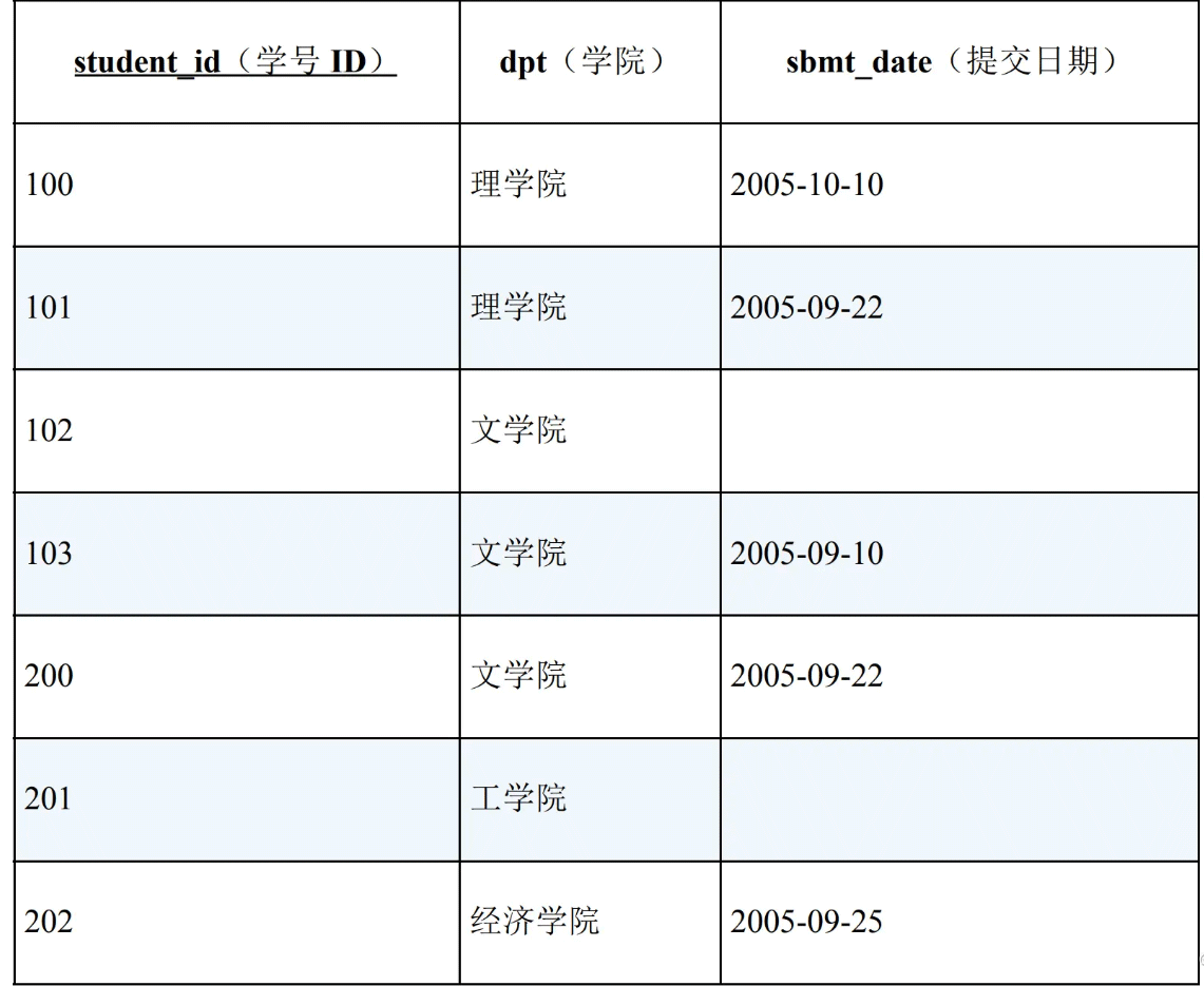 现在需要查找哪些学院的学生全部都提交了报告(即理学院、经济学院)。