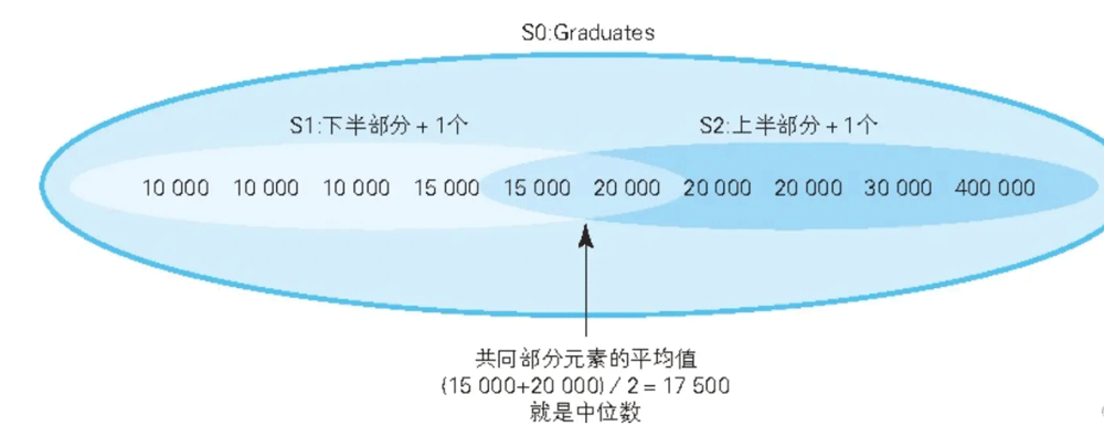 将集合里的元素按照大小分为上半部分和下半部分两个子集,同时让这 2 个子集共同拥有集合正中间的元素。