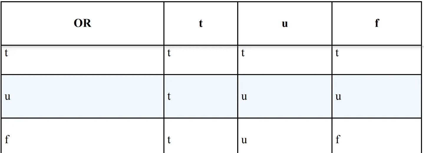举个栗子: true AND unknown ,因为 unknown 的优先级更高,所以结果是 unknown 。而 true OR unknown 的话,因为 true 优先级更高,所以结果是 true 。