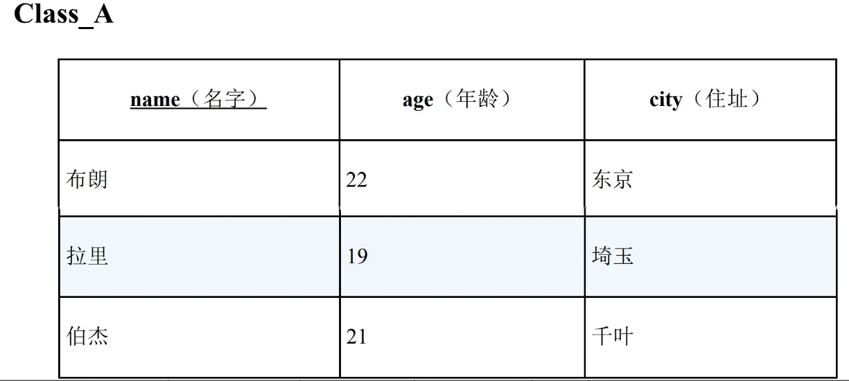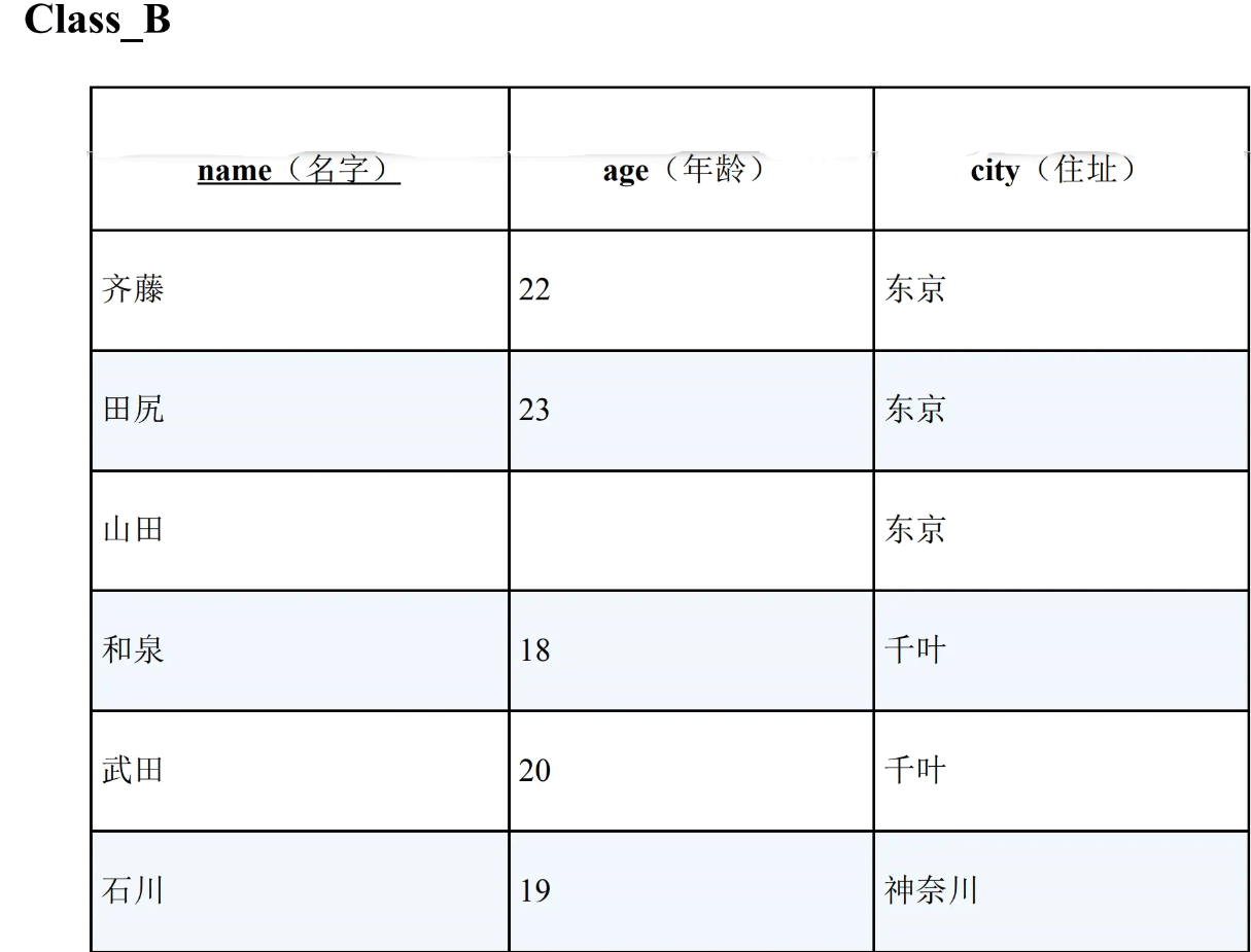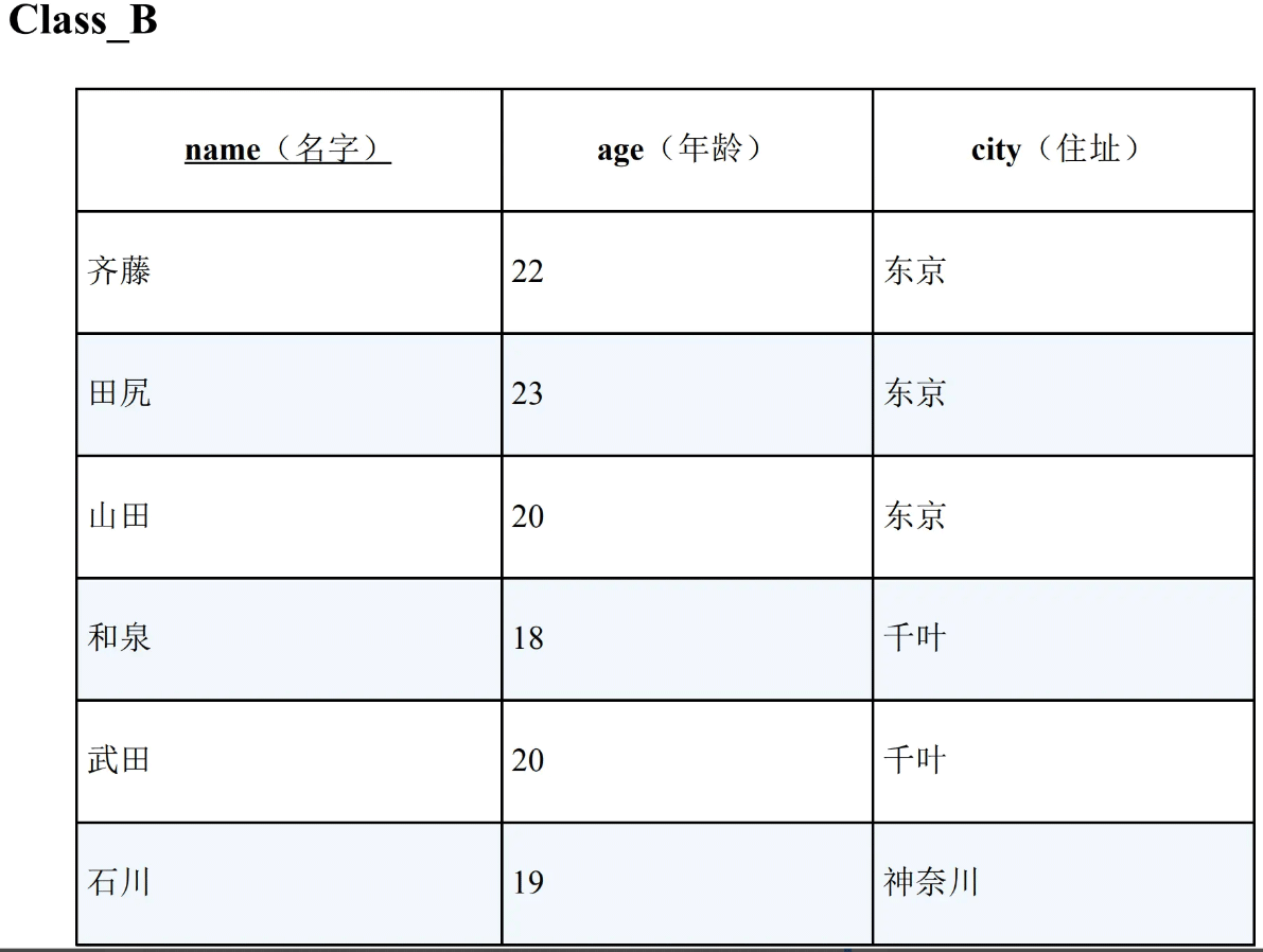 查询 “与 B 班住在东京的学生年龄不同的 A 班学生” 。也就是说,希望查询到的是拉里和伯杰。