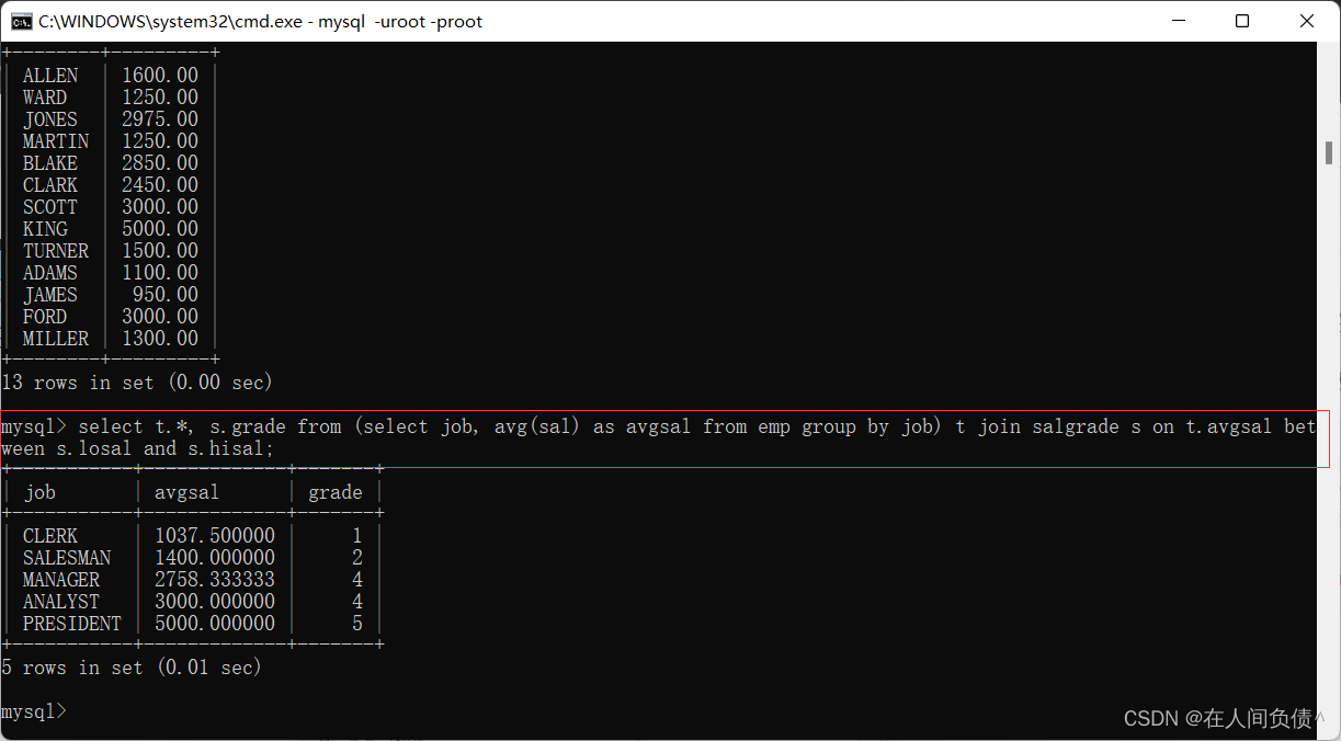 第二步:将以上的查询结果当做一张真实存在的表,将该表与 salgrade 进行连接