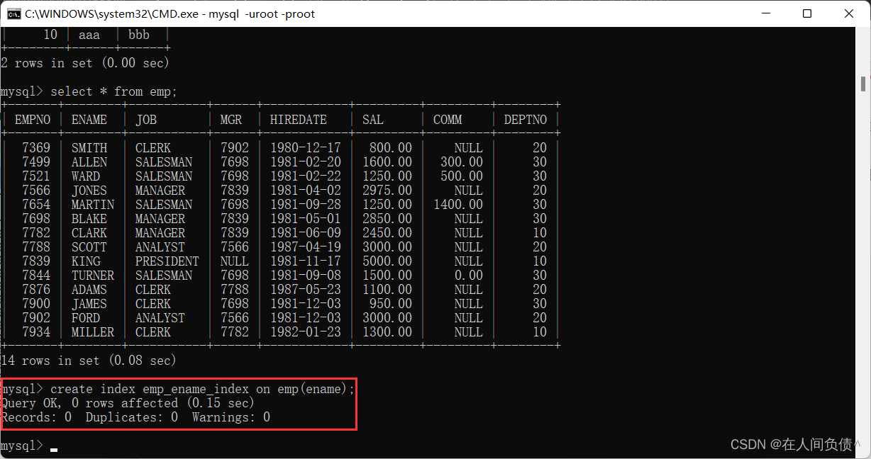 给 emp 表的 ename 字段添加索引,起名:emp_ename_index