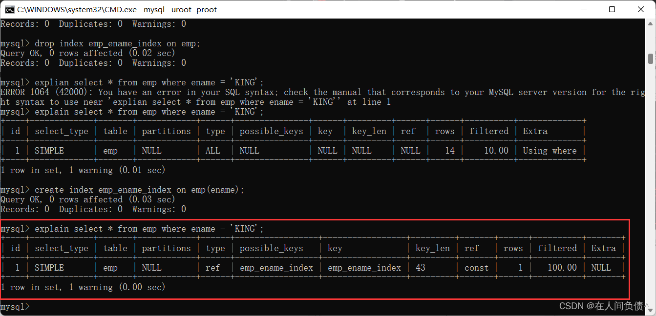 | 1 | SIMPLE | emp | NULL | ref | emp_ename_index | emp_ename_index | 43 | const | 1 | 100.00 | NULL |