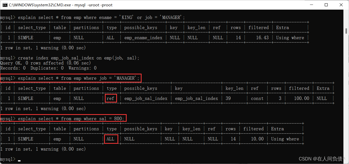 | 1 | SIMPLE | emp | NULL | ref | emp_job_sal_index | emp_job_sal_index | 39 | const | 3 | 100.00 | NULL |