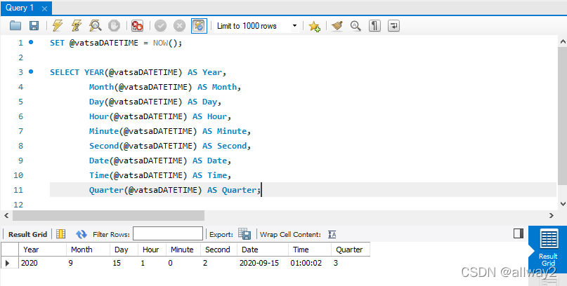 Quarter(‘2020-09-14 23:18:17’) AS Quarter;