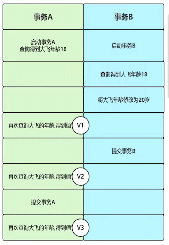 - RR-可重复读 级别:18、18、20 (不可能发生:脏读、不可重复读;但是因为事务A已提交,所以V3再次查询时跟事务A是没有隔离性的要求的,因此V3读取到的是20)