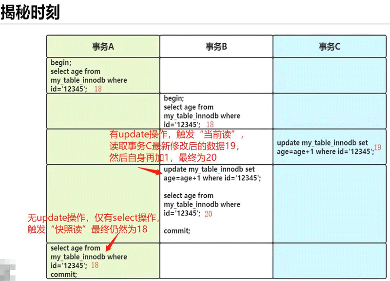 UPDATE写操作,触发了 当前读,所以要先去读最新提交的版本号记录(即:事务CUPDATE后提交的记录),然后事务B再去执行自己的UPDATE操作。也就是要先去读事务C提交的最新数据为19,然后事务B自身再UPDATE加1最终变为20。 - 针对 “事务A” 分析:因为事务A本身是没有任何的写操作,仅仅是