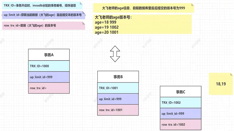 BEGIN事务开始的时候会创建一个快照,并为对应事务分配一个事务id,即 TRX_ID- 开启事务之前最后的版本号为:up_limit_id=999,对应 age=18