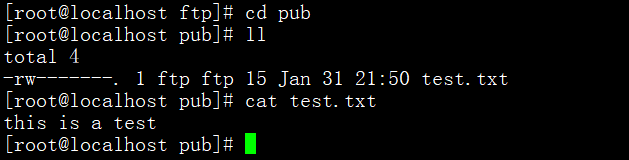 如果遇见以下情况,不要着急,可能是 pub 文件夹权限不够,提高权限即可:chmod 777 /var/ftp/pub