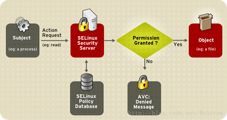 当一个subject(如: 一个应用)试图访问一个object(如:一个文件),Kernel中的策略执行服务器将检查AVC (Access Vector Cache), 在AVC中,subject和object的权限被缓存(cached)。如果基于AVC中的数据不能做出决定,则请求安全服务器,安全服务器在一个矩阵中查找“应用+文件”的安全环境。然后根据查询结果允许或拒绝访问,拒绝消息细节位于/var/log/messages中。
