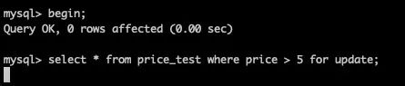 接着,我们在事务 B 执行如下命令,查询 price > 5 的记录。