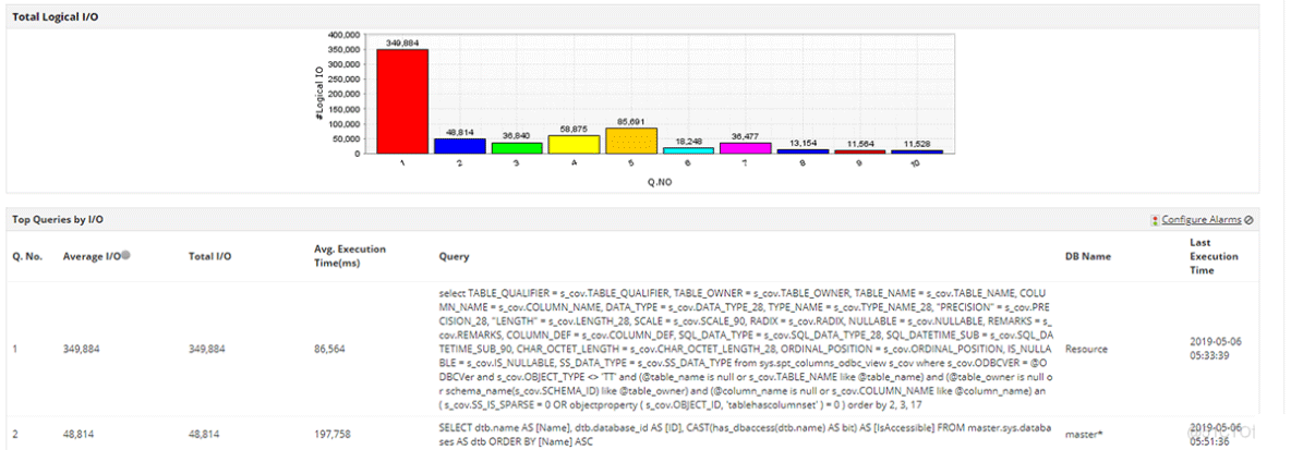 需要不断监控SQL查询,以确定延迟问题背后的原因。Applications Manager的SQL server监控工具提供了CPU顶级查询、I/O顶级查询、等待任务顶级等待、运行速度最慢的查询、最频繁执行的查询、最阻塞的查询等等的列表,帮助dba过滤出出现瓶颈的查询。