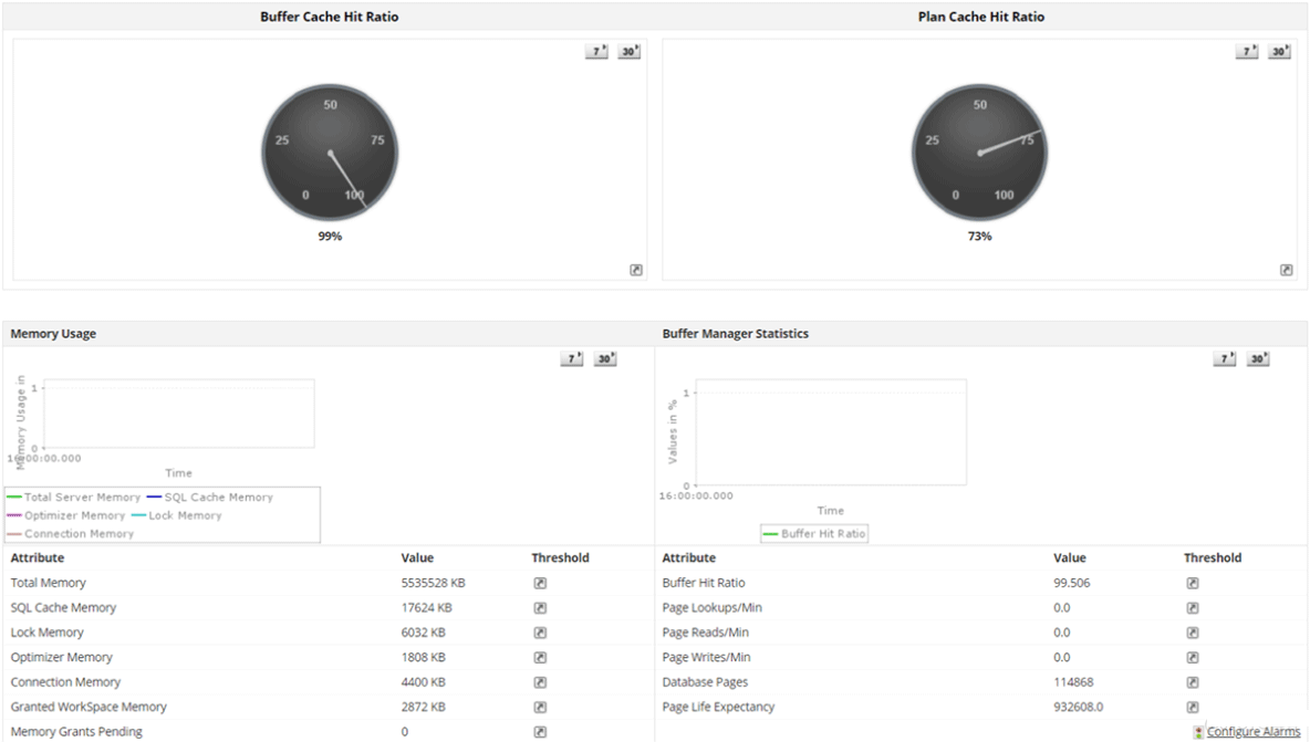 Application Manager的SQL性能监控器为dba提供了大量关于缓冲区缓存的信息,如缓冲区缓存命中率、页预期寿命、页读/分钟、页写/分钟,以及更多帮助他们了解缓冲区和缓存过程的信息。
