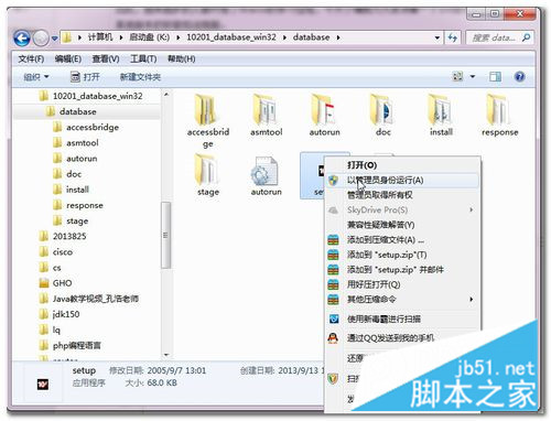如果是在win7上安装,如图:在setup文件上点击右键,选择以“管理员身份运行”。